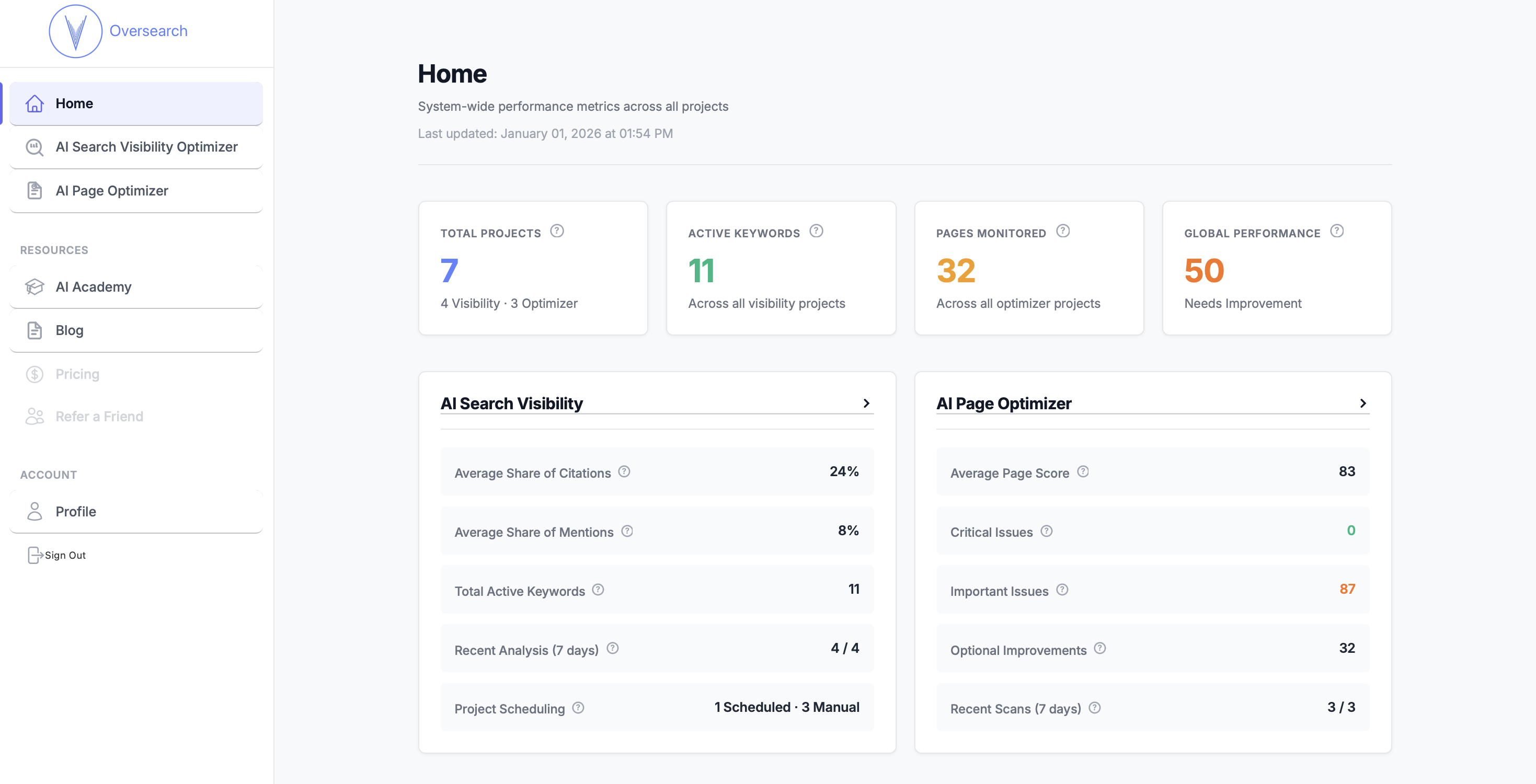 Oversearch helps you measure and improve how often you show up in AI answers, then turns that into a concrete page-level action plan.